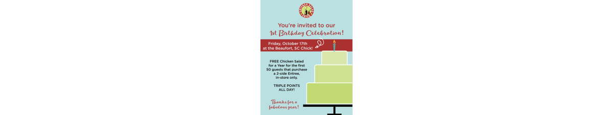 You're invited to our 1st Birthday Celebration at the Beaufort, SC Chick!