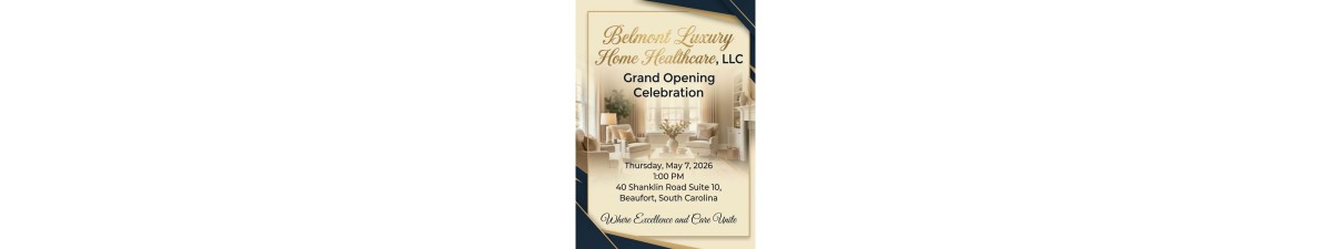 Ribbon Cutting for Belmont Luxury Home Healthcare Date and Time Thursday May 7, 2026 1:00 PM - 2:00 PM EDT Location 40 Shanklin Road, Ste 10 Beaufort, SC 29906 Set a Reminder Enter your email address below to receive a reminder message. Email address Select the amount of Days before the event -- Select Days Before Event -- 1 Day 2 Days 3 Days 1 Week Captcha Validation Please complete the Captcha Submit Description Join the Chamber as we welcome and celebrate Belmont Luxury Home Healthcare! Set a Reminder Enter your email address below to receive a reminder message. Email address Select the amount of Days before the event -- Select Days Before Event -- 1 Day 2 Days 3 Days 1 Week Captcha Validation Please complete the Captcha Submit Share × Print Email Add to Calendar Facebook Twitter LinkedIn Tell a Friend × Select Calendar Type × Google Yahoo iCal (Outlook, Apple, or other)