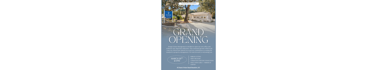 Ribbon Cutting for Stinger Home Management Date and Time Friday Mar 20, 2026 1:00 PM - 1:00 PM EDT Location Stinger Home Management 65 Sam's Point Road Beaufort, SC 29907 Set a Reminder Enter your email address below to receive a reminder message. Email address Select the amount of Days before the event -- Select Days Before Event -- 1 Day 2 Days 3 Days 1 Week Captcha Validation Please complete the Captcha Submit Description Join us as we celebrate Stinger Home Managements important milestone! Let's cut the ribbon on their new office! Set a Reminder Enter your email address below to receive a reminder message. Email address Select the amount of Days before the event -- Select Days Before Event -- 1 Day 2 Days 3 Days 1 Week Captcha Validation Please complete the Captcha Submit Share × Print Email Add to Calendar Facebook Twitter LinkedIn Tell a Friend × Select Calendar Type × Google Yahoo iCal (Outlook, Apple, or other)