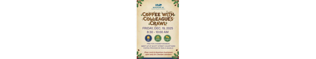Join us for a morning of networking, shopping, and holiday cheer at Coffee with Colleagues Crawl with our Downtown Beaufort Members! Meet at Rain-N-Bagels for coffee and light bites, then explore downtown Beaufort's amazing local businesses!