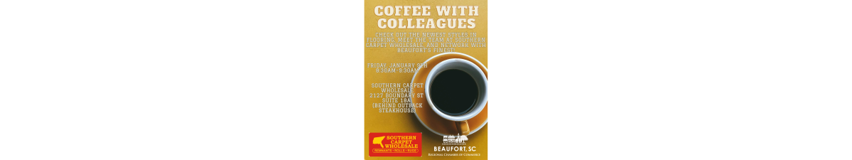 Coffee with Colleagues hosted by Southern Carpet Wholesale Date and Time Friday Jan 9, 2026 8:30 AM - 9:30 AM EST Location 2127 Boundary Street Ste 18A Beaufort, SC 29902 Fees/Admission Free for Chamber Members! Set a Reminder Enter your email address below to receive a reminder message. Email address Select the amount of Days before the event -- Select Days Before Event -- 1 Day 2 Days 3 Days 1 Week Captcha Validation Please complete the Captcha Submit Description Join us at Southern Carpet Wholesale for January's Coffee with Colleagues! Set a Reminder Enter your email address below to receive a reminder message. Email address Select the amount of Days before the event -- Select Days Before Event -- 1 Day 2 Days 3 Days 1 Week Captcha Validation Please complete the Captcha Submit Share × Print Email Add to Calendar Facebook Twitter LinkedIn Tell a Friend × Select Calendar Type × Google Yahoo iCal (Outlook, Apple, or other)