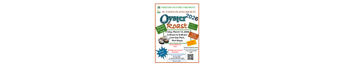 Our annual Oyster Roast, sponsored by the Friends and the SC Native Plant Society, will be held March 13, 2026, in Port Royal at Live Oak Park from 5:30 to 8:00 PM. BYOB and chairs. No walk-ins on the day of the event. Again, music will be by the "Sweet Ferns," Oysters & Chili by Sea Eagle Catering, and desserts & appetizers contributed by The Friends of Fort Fremont. And don't forget to check here later for items in our famous Friends of Fort Fremont Silent Auction.