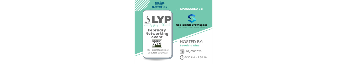 Lowcountry Young Professionals Social Date and Time Thursday Feb 5, 2026 5:30 PM - 7:30 PM EST Location Beaufort Wine 1113 Harrington Street Beaufort, SC 29902 Set a Reminder Enter your email address below to receive a reminder message. Email address Select the amount of Days before the event -- Select Days Before Event -- 1 Day 2 Days 3 Days 1 Week Captcha Validation Please complete the Captcha Submit Description Join us for the February LYP Networking Social at Beaufort Wine, sponsored by Sea Islands Crawlspace. Set a Reminder Enter your email address below to receive a reminder message. Email address Select the amount of Days before the event -- Select Days Before Event -- 1 Day 2 Days 3 Days 1 Week Captcha Validation Please complete the Captcha Submit Share × Print Email Add to Calendar Facebook Twitter LinkedIn Tell a Friend × Select Calendar Type × Google Yahoo iCal (Outlook, Apple, or other)
